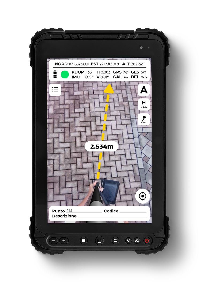 I punti da rilevare appaiono direttamente sul terreno, permettendo ai tecnici di raggiungerli in un solo passaggio. Frecce chiare sulla mappa in real-time li guidano, riducendo i continui aggiustamenti e rendendo il lavoro più veloce e preciso.